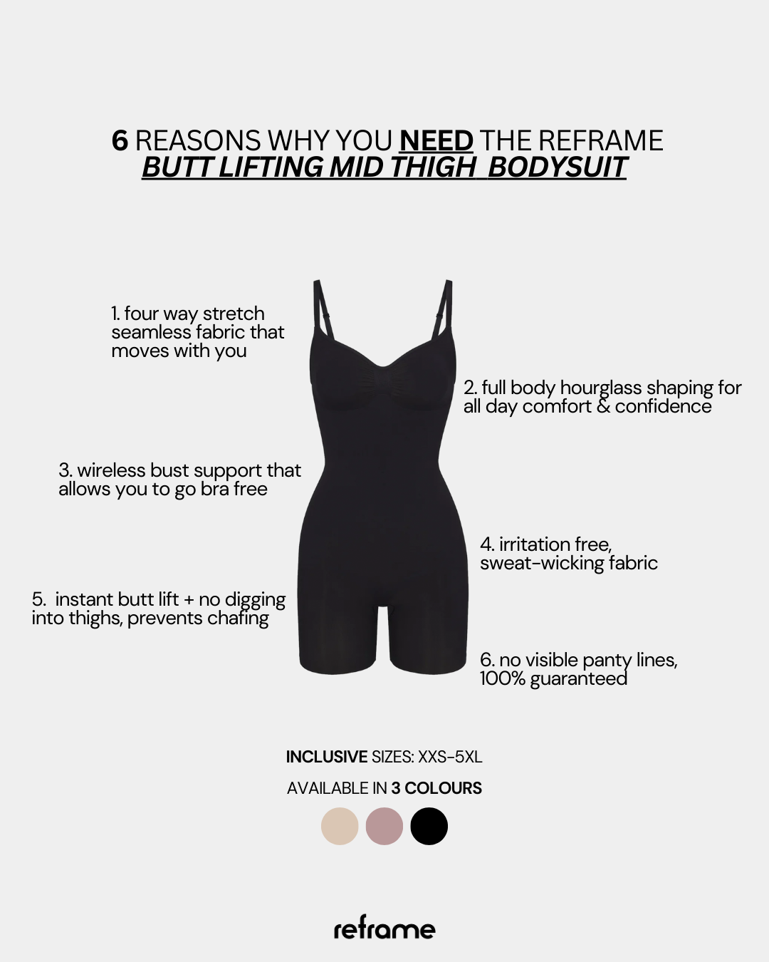 This all-in-one bodysuit sculpts your waist, smoothens thighs, and lifts your butt - all while staying invisible under clothes. Designed with targeted compression panels and shaping pockets at the back for a natural lift, it contours without restricting. Features no dig in seam for all day comfort around the thighs and an open gusset for easy bathroom access, this bodysuit does it all without any compromise.