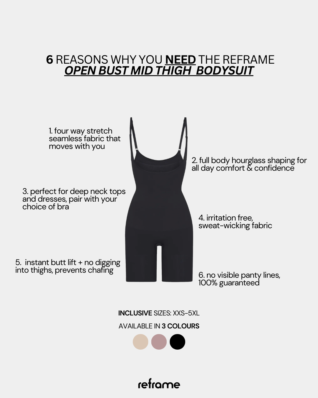 Designed to be worn with your favourite bra, this bodysuit sculpts the waist, adds definition to the butt and smoothens thighs while staying completely invisible under clothes. Its open-bust design pairs perfectly with deep, plunging necklines giving you sculpted support without sacrificing style. Features no dig in seam for all day comfort around the thighs and an open gusset for easy bathroom access.
