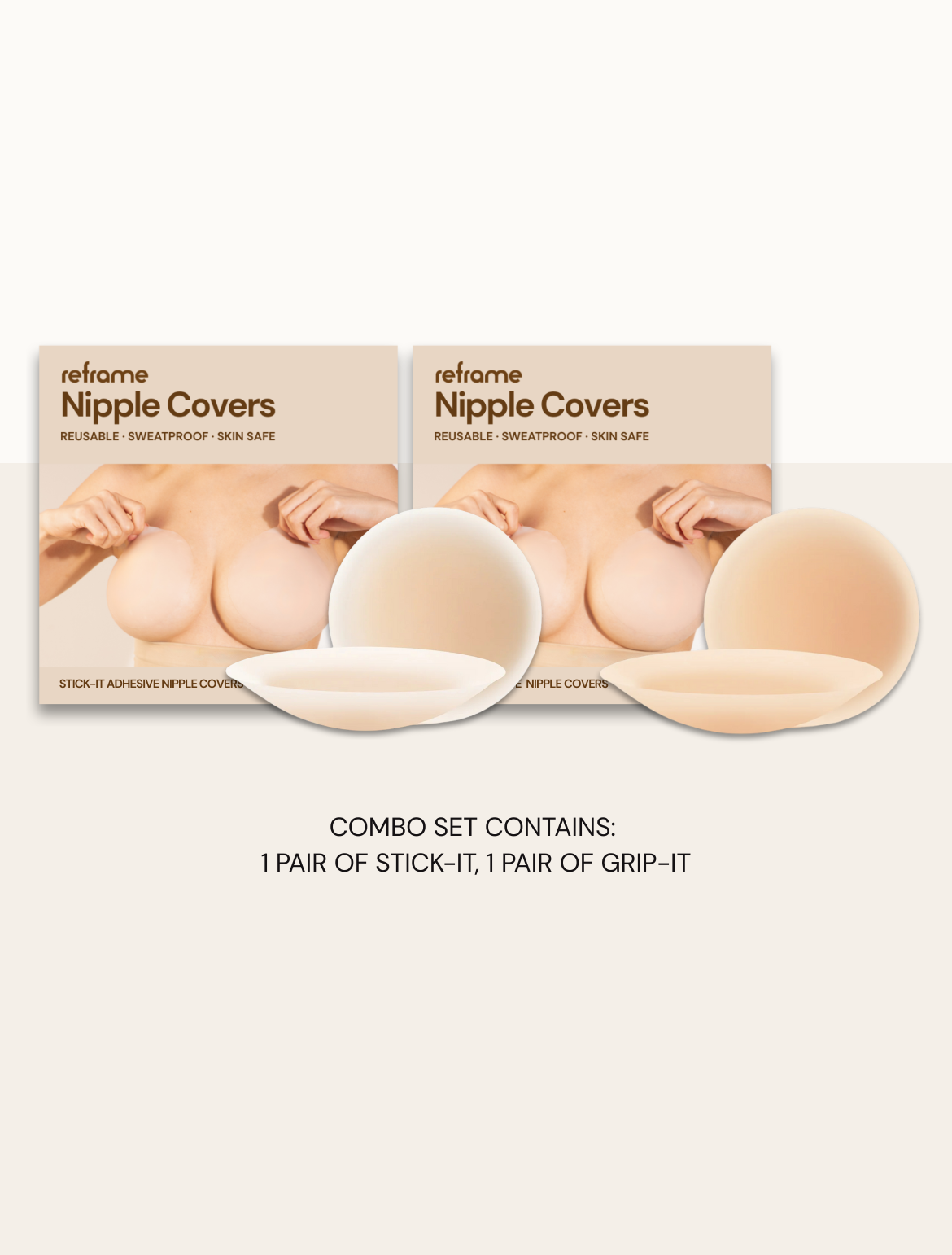 Meet Reframe's ultimate nipple cover duo designed for days where one solution isn't enough. Experience full coverage under whatever you wear. From AA cup to DD+ cup size, this duo has you covered.
