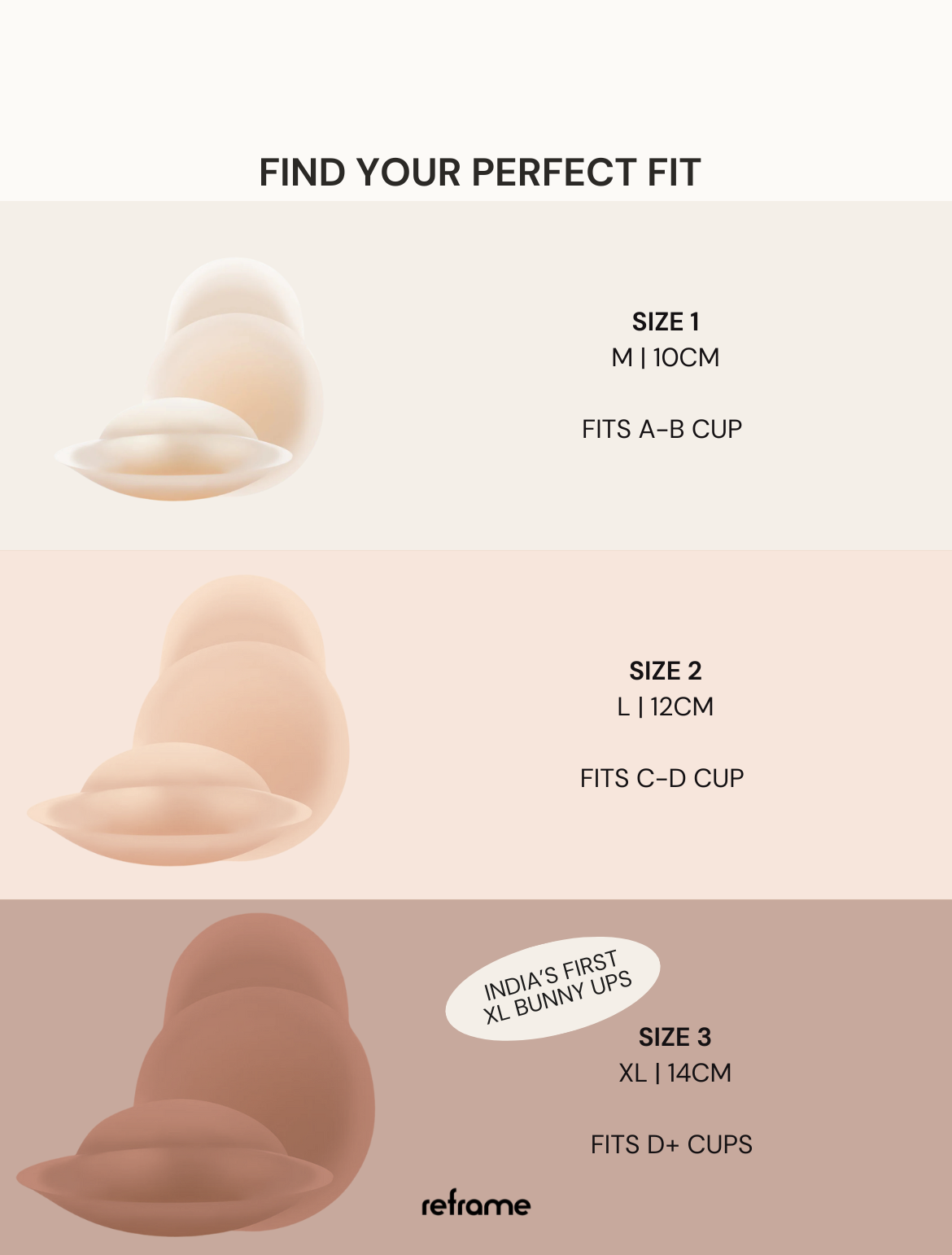 NOTE: These bunny ups are designed to offer a natural lift and merge seamlessly into your skin. Always opt for the bigger size if you are in between sizes. You may need boob tape for additional support if youâre larger than a D cup.